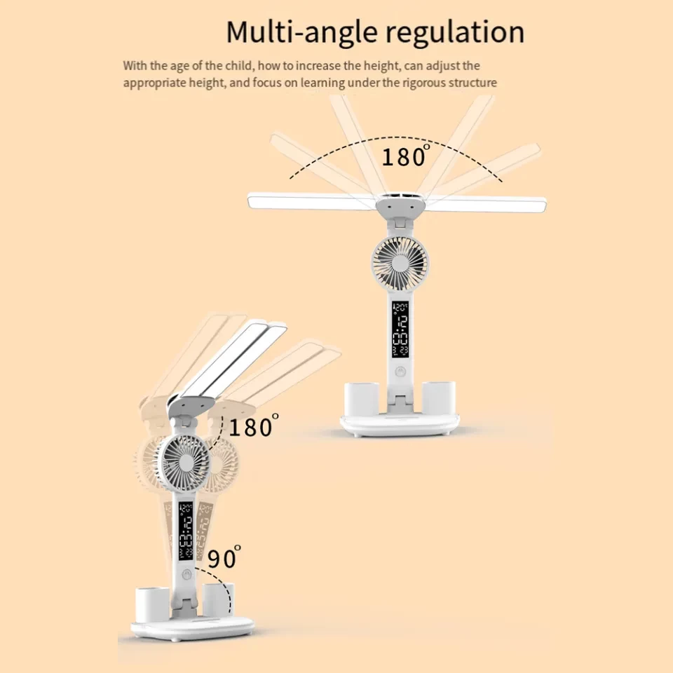 Rechargeable LED Desk Lamp for Study & Reading – With Fan, Clock Display, and Adjustable Lighting