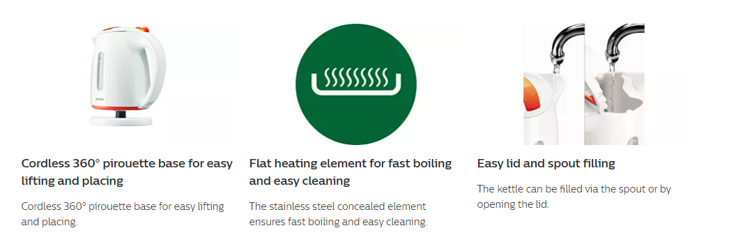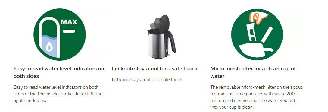 Water level indicators that are simple to read on both sides The left and right handed users of the Philips electric kettle can easily read the water level indicators located on both sides.