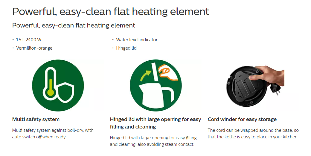 Auto shut-off is activated when the water boils.many safety systems When ready or when lifted from the base, a multi-safety system with auto-switch-off protects against short circuit and boil-dry. Large opening on a hinged lid that makes filling and cleaning simple Large opening on the hinged lid makes it simple to fill and clean while keeping steam out of the way.