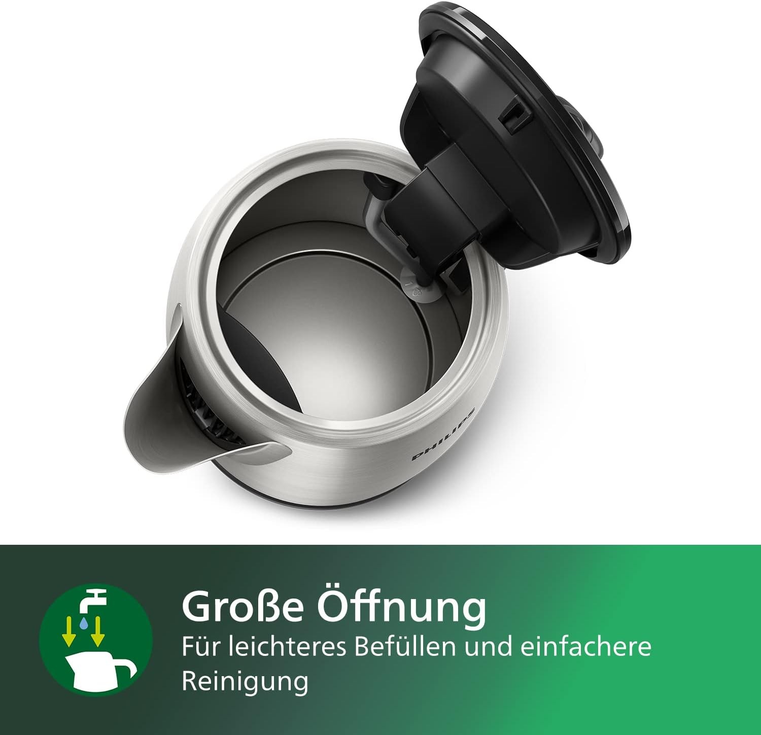 The sleek HD9350 kettle in stainless steel has a flat heating element that is easy to clean and guarantees boiling water in a matter of seconds. It is simple to open with its spring-loaded lid opening.